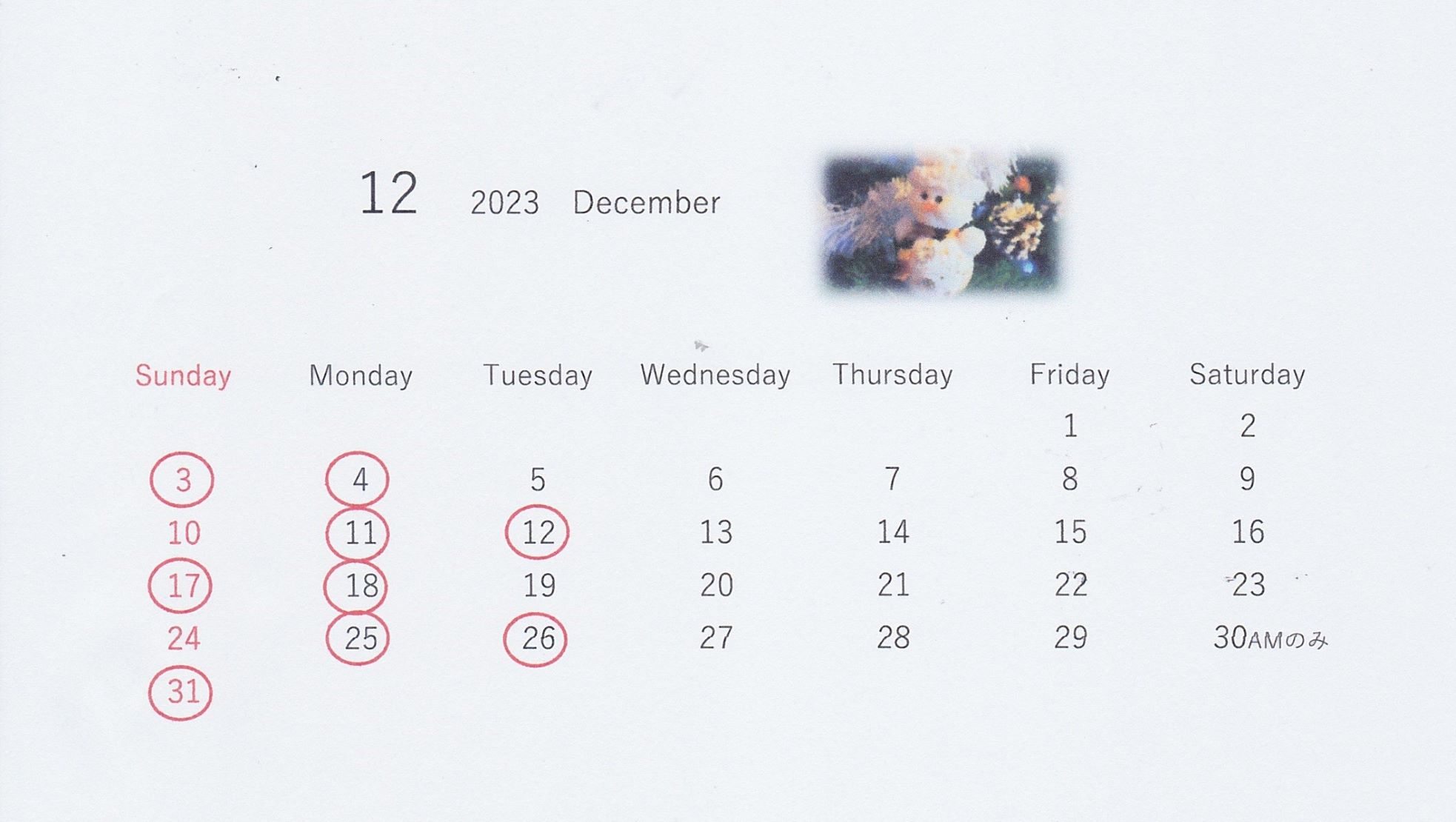 12月の営業日カレンダーです。