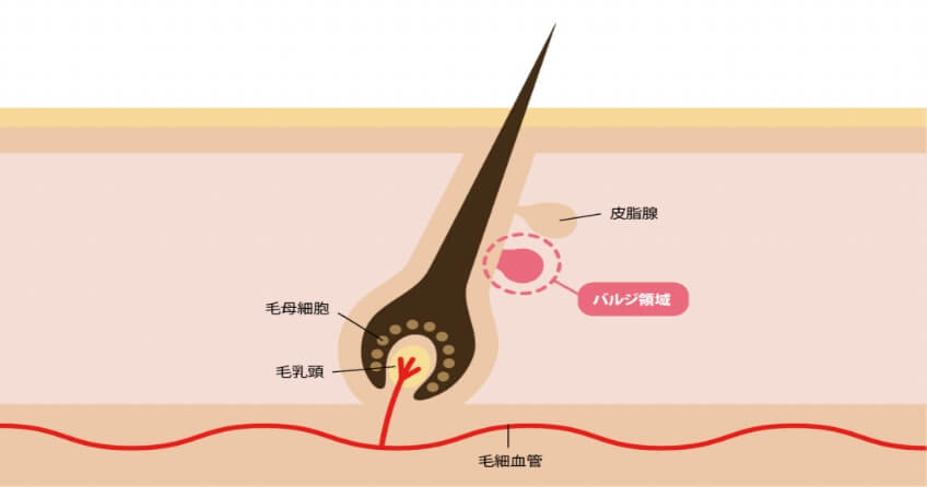 その為、休止期の毛は毛根部にメラニン色素がないため、除毛・減毛のターゲットに はなりませんでしたが、LED脱毛のターゲットは、今までのIPL方式+バルジ領域になり、バルジ領域に対して適切な照射を行うことで、発毛因子の発生を阻害させ発毛組織の働きを休止させ、より早い結果を期待することができます。